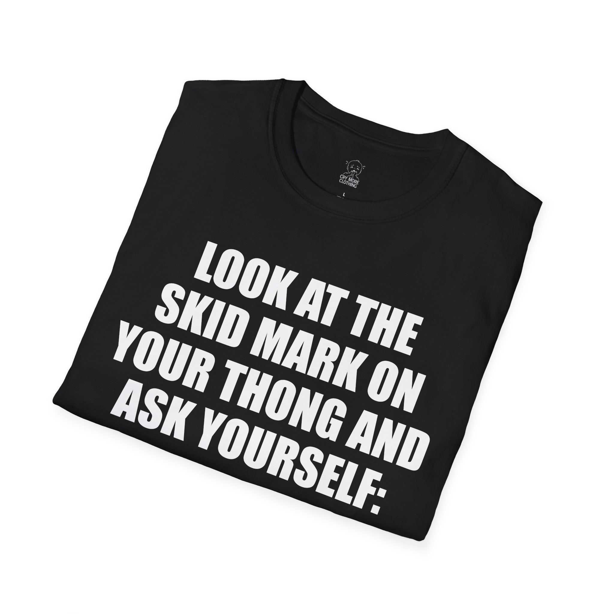 This soft, lightweight tee carries a bold, cheeky message in clean, high-contrast type — loud enough to start conversations and light enough to wear all day. The crewneck silhouette sits comfortably at the collar while the classic fit gives room to move without feeling boxy. It slips easily under a jacket or pairs with jeans and sneakers for an offbeat, confident look. Wear it to a casual night out, a relaxed get-together, or whenever you want your sense of humor to lead the way. The smooth, durable cotton keeps prints crisp and the tear-away label keeps the back of your neck irritation-free so you can keep the focus on the joke, not the shirt.