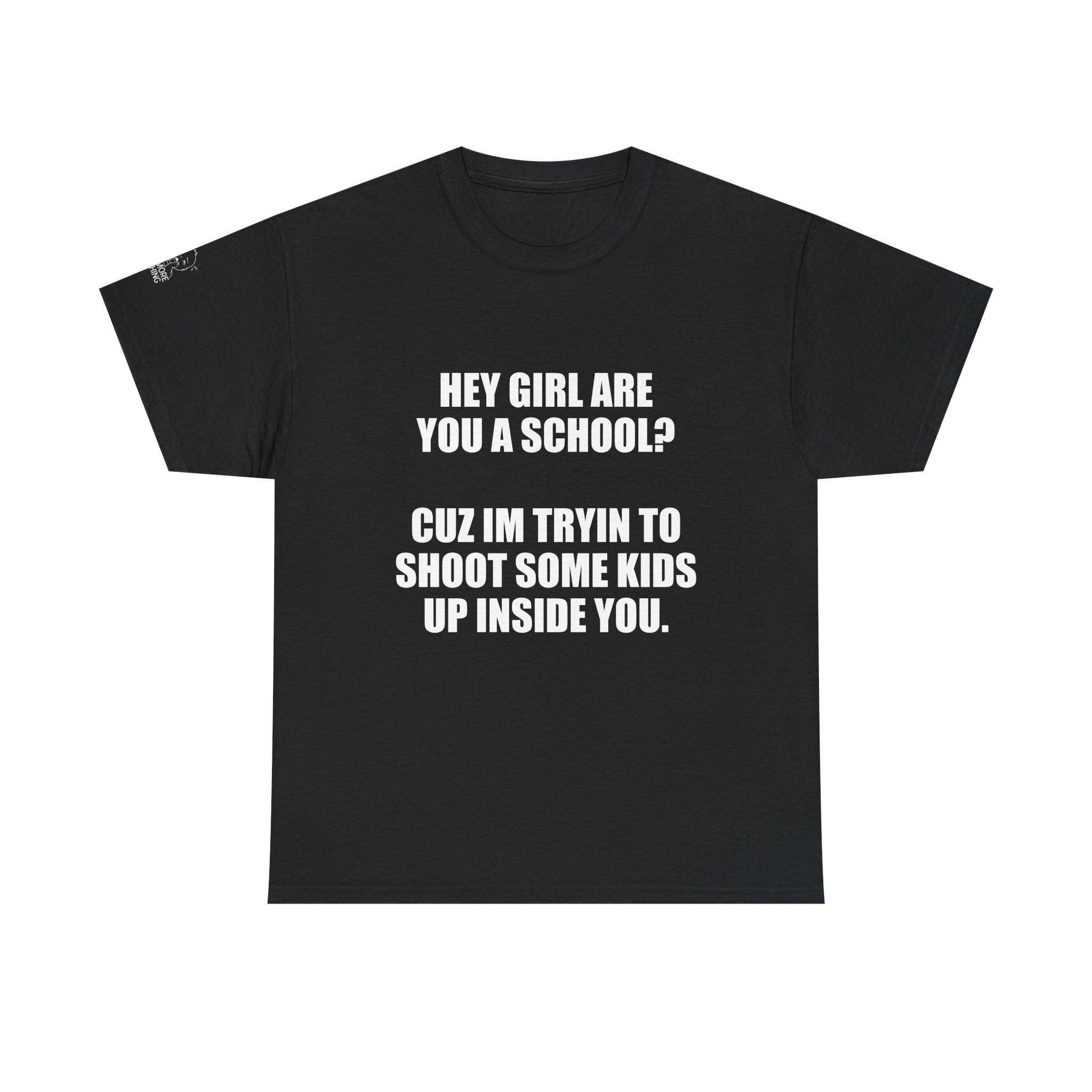 This black classic-fit tee carries a confrontational, dark-humored slogan in bold white type across the chest. The message reads like a blunt, satirical pickup line — raw, shocking, and meant to provoke a reaction. The shirt’s silhouette is relaxed and familiar: a crew neckline, short sleeves, and a straight hem that layers easily under jackets or stands alone.