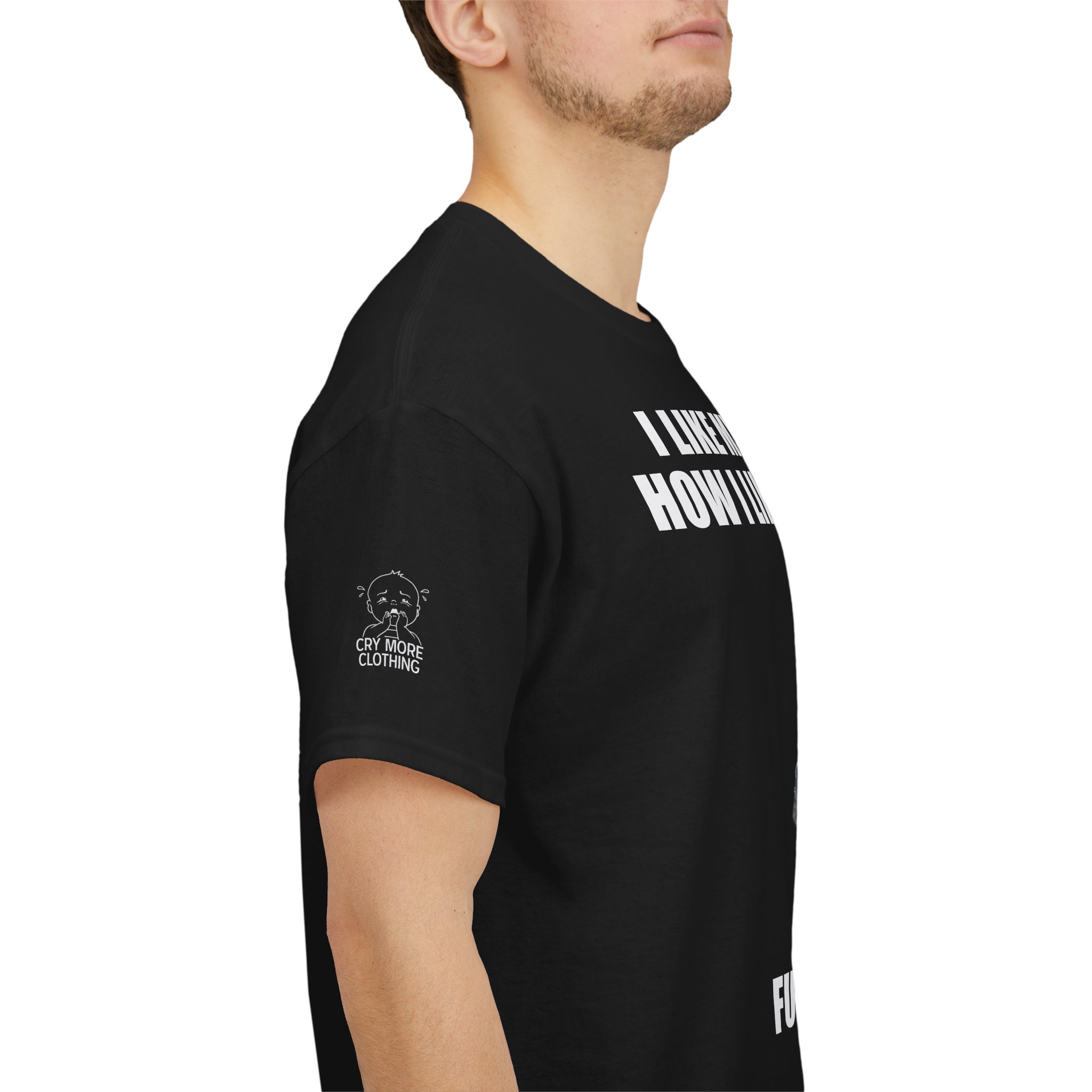 A simple, bold tee that speaks with quiet confidence. The clean white block text on a deep black canvas reads like a statement piece—subtle, direct, and a little defiant. It settles into the wardrobe of someone who prefers blunt honesty over ornamentation. Wear it on long drives, at weekend meetups, or stacked under a jacket for evenings when you want your message to do the talking. The lumbering, straightforward type gives it an almost vintage protest feel while the soft, midweight cotton keeps it comfortable for everyday wear.