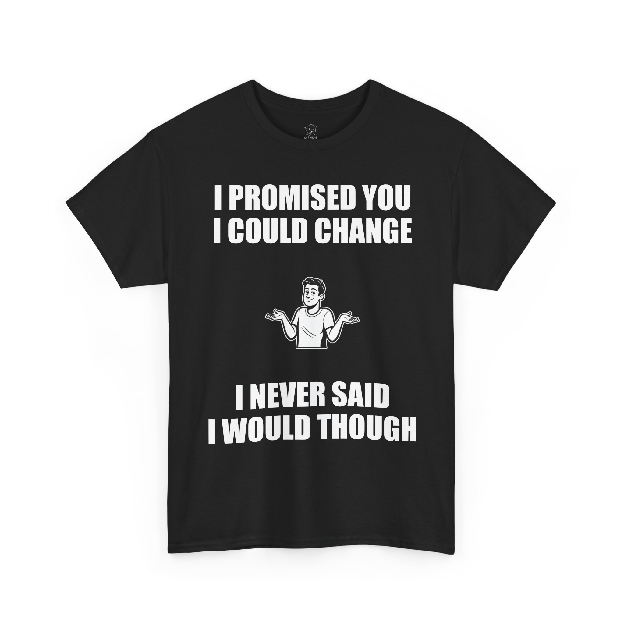 This relaxed-fit tee carries a wry, confident vibe. Soft, midweight cotton feels familiar from the first wear, while the bold white print — a shrugging figure framed by the lines “I promised you I could change / I never said I would though” — reads like a private joke turned manifesto. It layers easily under jackets or stands alone as a statement piece for nights out, road trips, or coffee shop hangs. The tubular knit construction and ribbed collar keep the silhouette clean, and the tear-away label keeps the neck itch-free. Wash after wash it keeps its shape, so the message stays sharp.