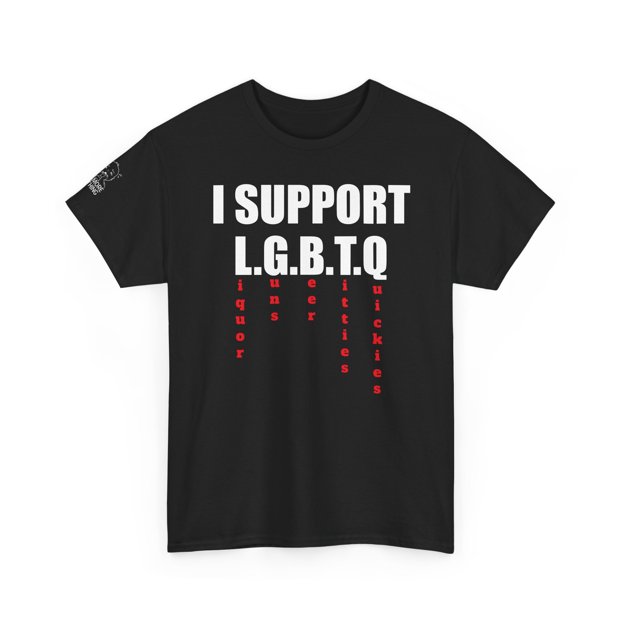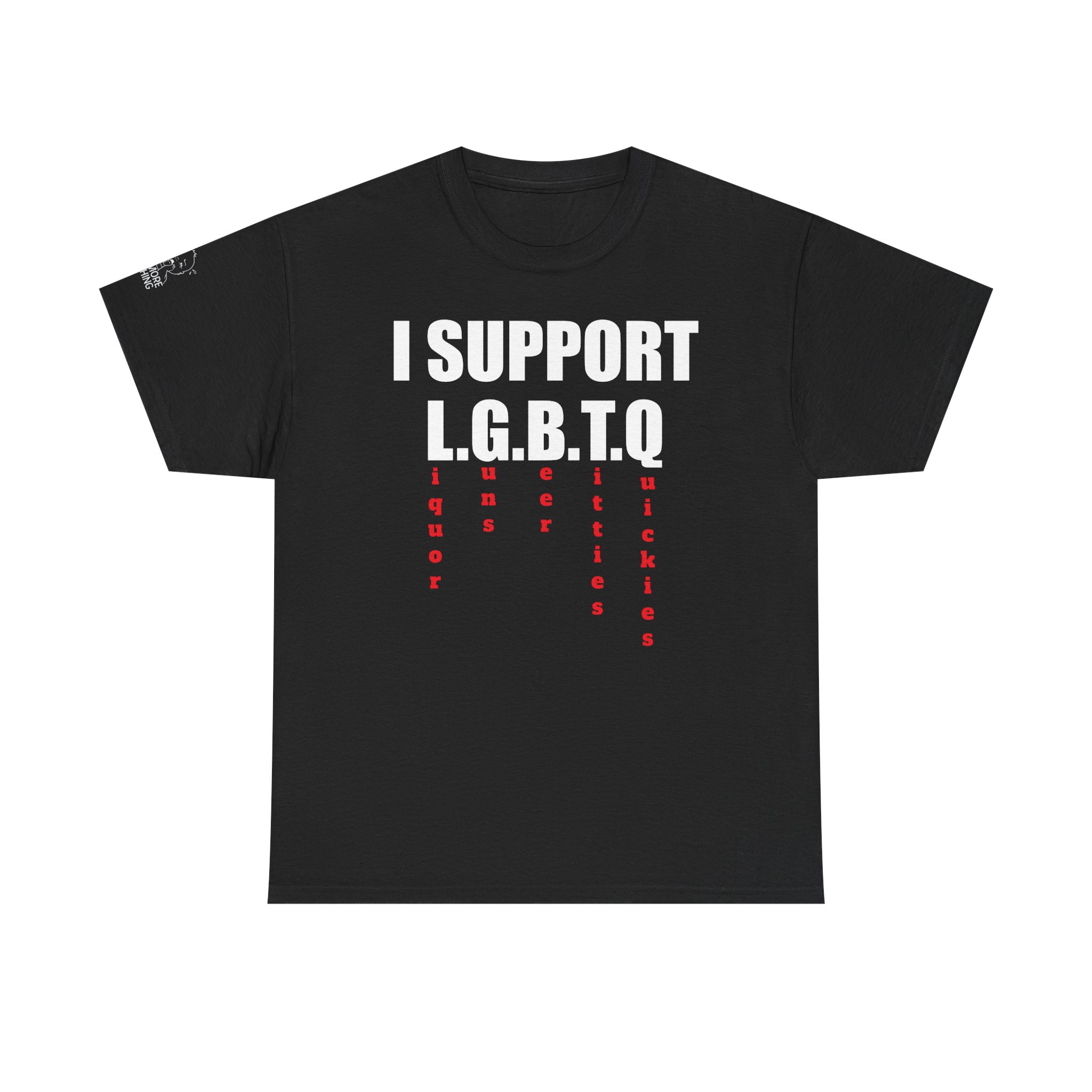 This black cotton tee carries a bold, activist heart. The front declares “I SUPPORT L.G.B.T.Q” in stark white block letters, with red vertical text dripping beneath — names and causes cascading like a list of allies. It’s a quiet-but-firm statement piece: comfortable, breathable, and built to last so the message can be worn again and again. The classic crew neck and relaxed fit make it easy to layer under a jacket or wear on its own to marches, meetups, or low-key days out. Subtle sleeve and inner-label prints add thoughtful detail without stealing the spotlight from the message.