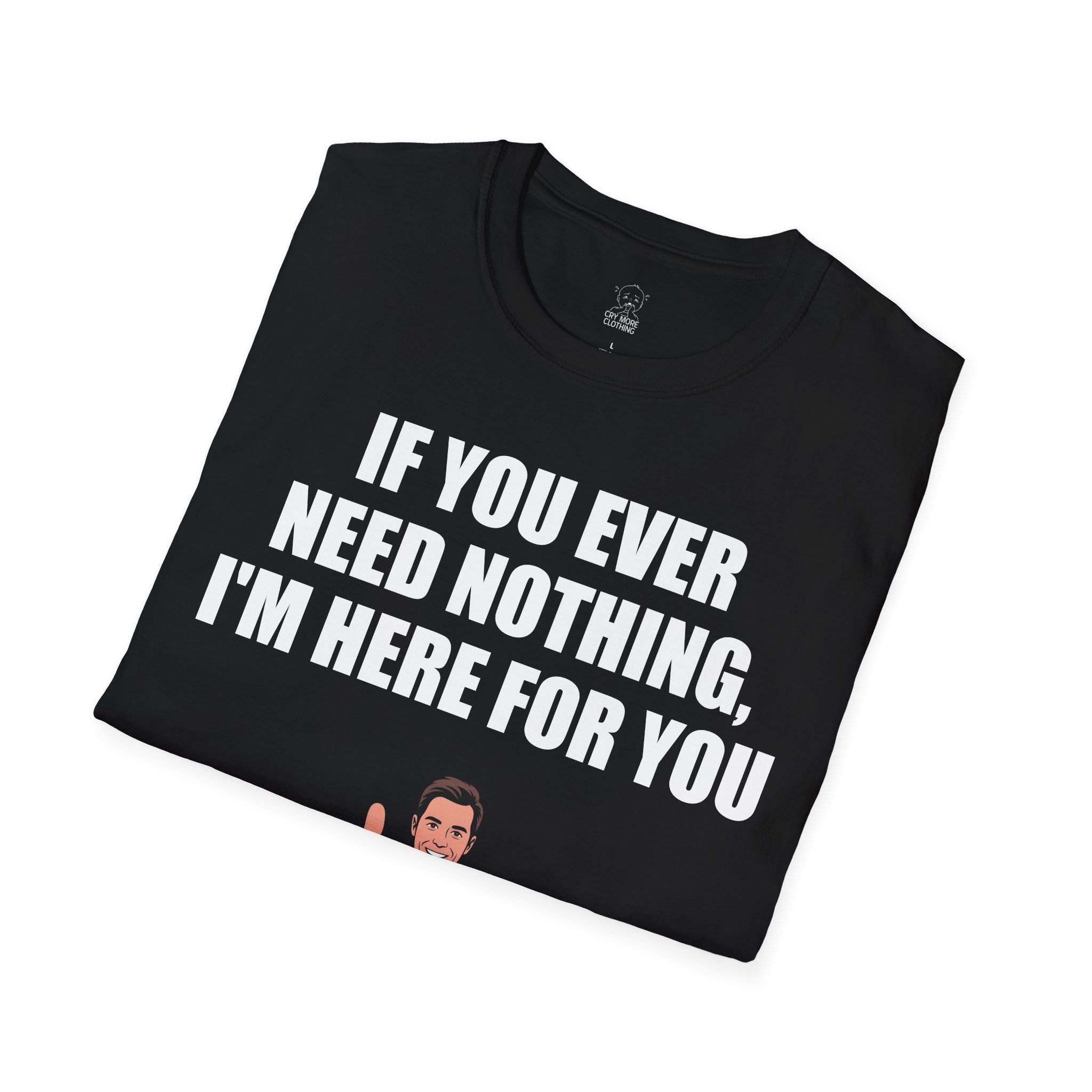 A soft, lightweight tee that speaks the language of dry humor and quiet support. The simple crew-neck silhouette carries a bold, white slogan above a friendly illustrated figure giving a thumbs-up: “IF YOU EVER NEED NOTHING, I’M HERE FOR YOU.” It’s the sort of shirt that starts conversations in laid-back settings — a wink at friends, a gentle nudge in the break room, or a laugh over coffee. Wear it when you want to show up without taking things too seriously. The fabric feels smooth against the skin, drapes cleanly thanks to its classic fit, and keeps its shape through repeated wear. Built with responsibly sourced cotton and attention to finishing details like a tear-away label and reinforced shoulders, this tee blends humor with comfort and a thoughtful, dependable construction.