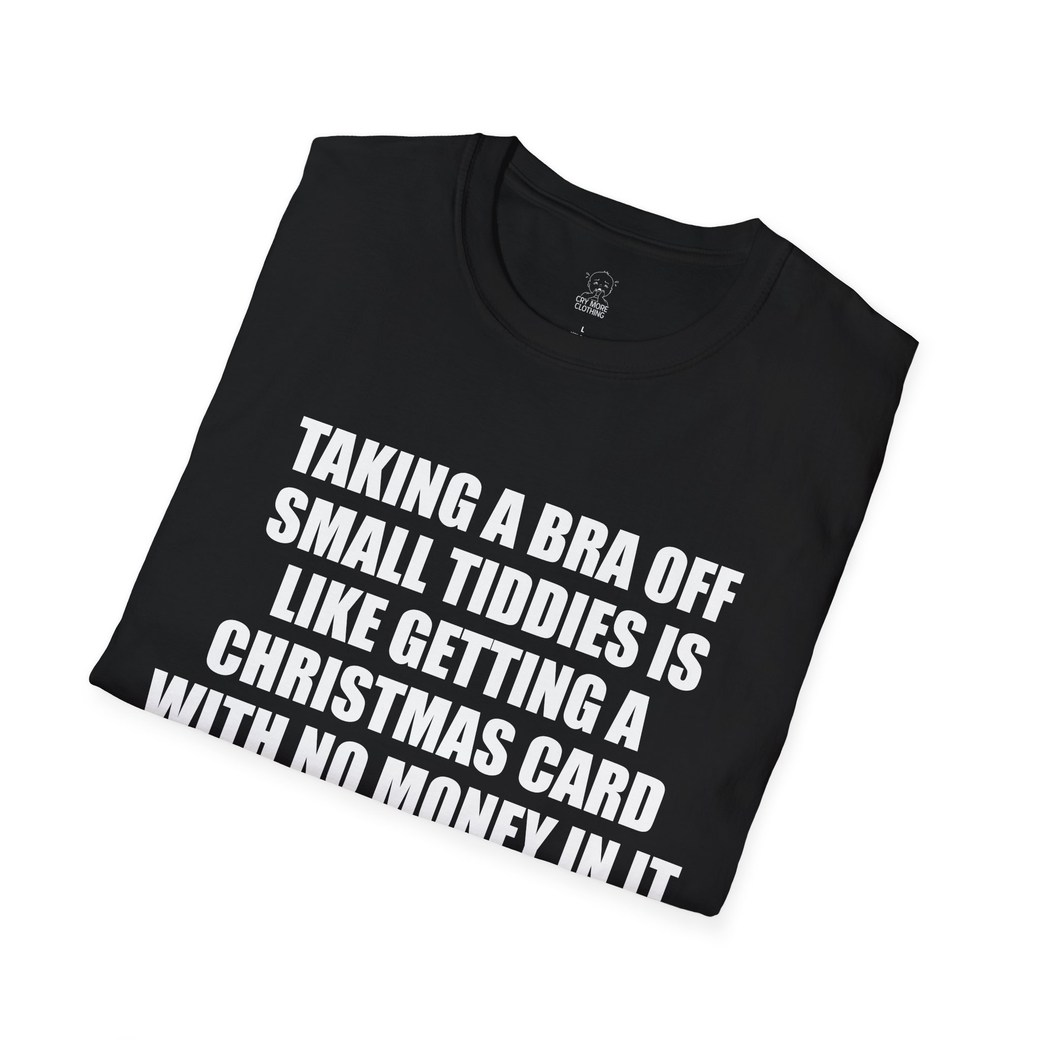 A lightweight, soft cotton tee with bold, humorous text that speaks straight to people who appreciate dry, irreverent humor. The clean white block lettering pops against a deep black fabric for high-contrast impact. Wear it to break the ice at casual meetups, to spark laughs at holiday parties, or when you want a low-effort outfit that shows your cheeky side. The shirt drapes comfortably, keeps its shape after washing, and feels breathable all day — the kind of tee you reach for when you want to be relaxed and a little bit bold.